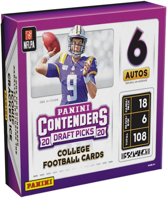 2020 Panini Contenders Draft Picks Football trading cards comes with 18 cards per pack and 6 packs per box.