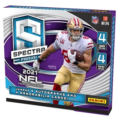 The 2021 Panini Spectra NFL Trading Cards Box (Hobby) contains 4 cards per pack and 4 packs per box!