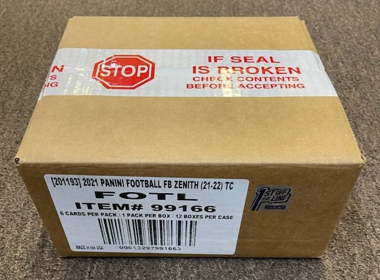 A case contains TWELVE 2021 Panini FOTL Zenith NFL Football Hobby Boxes. Case is Factory Sealed and will be double-boxed for shipping.