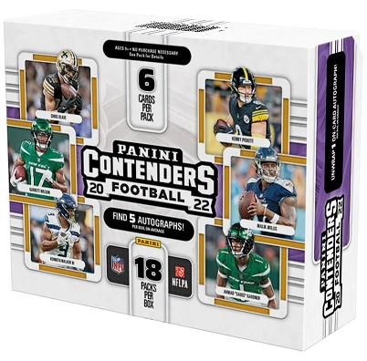 The 2022 Panini Contenders NFL Trading Card Box (Hobby) contains 6 cards per pack and 18 packs per box!Â