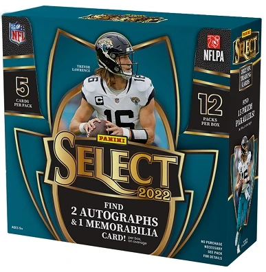 The 2022 Panini Select NFL Trading Card Box (Hobby) contains 5 cards per pack and 12 packs per box!