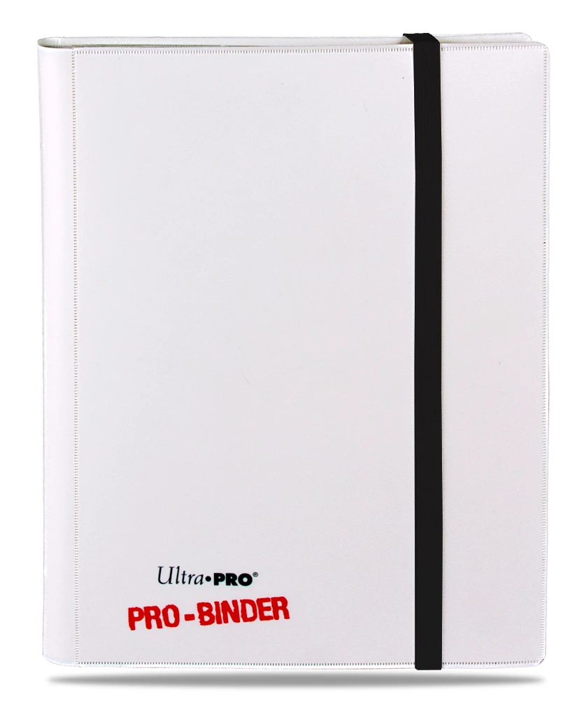 9-pocket White PRO-Binder with embossed middle white web material gives cards a clean framed look. Side loading pocket design to prevent cards from easily falling out. Black elastic strap holds the binder shut when not in use. All materials made from archival-safe, acid-free non-PVC material. Holds 360 cards in Ultra Pro Deck Protector sleeves.