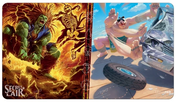 Playmats feature popular Magic: The Gathering artwork of Blanka, Ferocious Friend & E. Honda, Sumo Champion from the Secret Lair x Street Fighter Secret Lair Drop. Made with a soft fabric top to reduce damage to cards during play and a non-slip rubber backing to keep the playmat from shifting during use, playmats enhance the gameplay experience. With dimensions of approximately 24 in. x 13.5 in., a playmat also makes an excellent oversize mousepad for home or office.